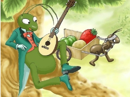 Csak pihen és hegedül míg a hangya szorgosan dolgozik. A tücsök úgy gondolta a hangya bolond és végigmulatta a nyarat. Még egy picinke kisdarab legye vagy férge sem maradt. Hét ment is a hangyához át elpanaszolni nyomorát és kérte adjon néki kölcsön zsákjába egy kis magot töltsön.